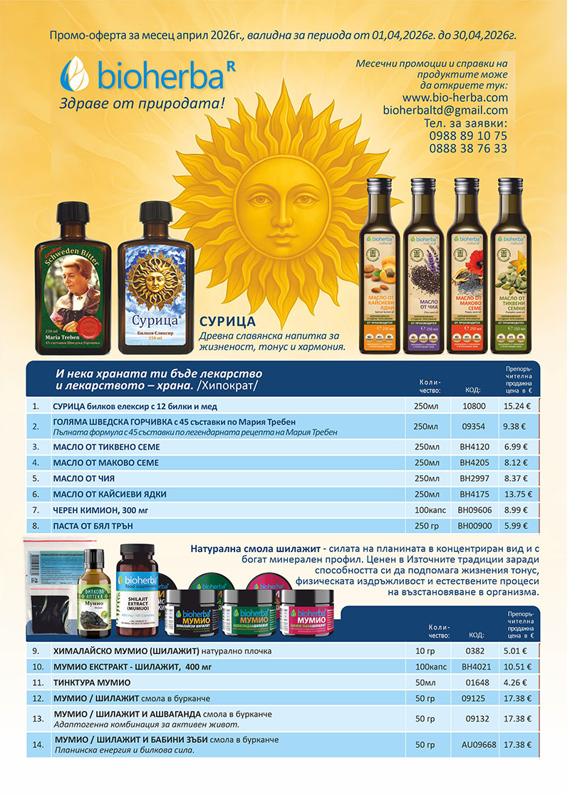 Уведомяваме ви, че от 15.12.2025 г. са въведени промени в някои цени. Поради текущата актуализация е възможно част от информацията на сайта да не е напълно коректна. Работим по отразяването на всички промени в най-кратък срок. За въпроси оставаме на разположение на bioherbaltd@gmail.com.
