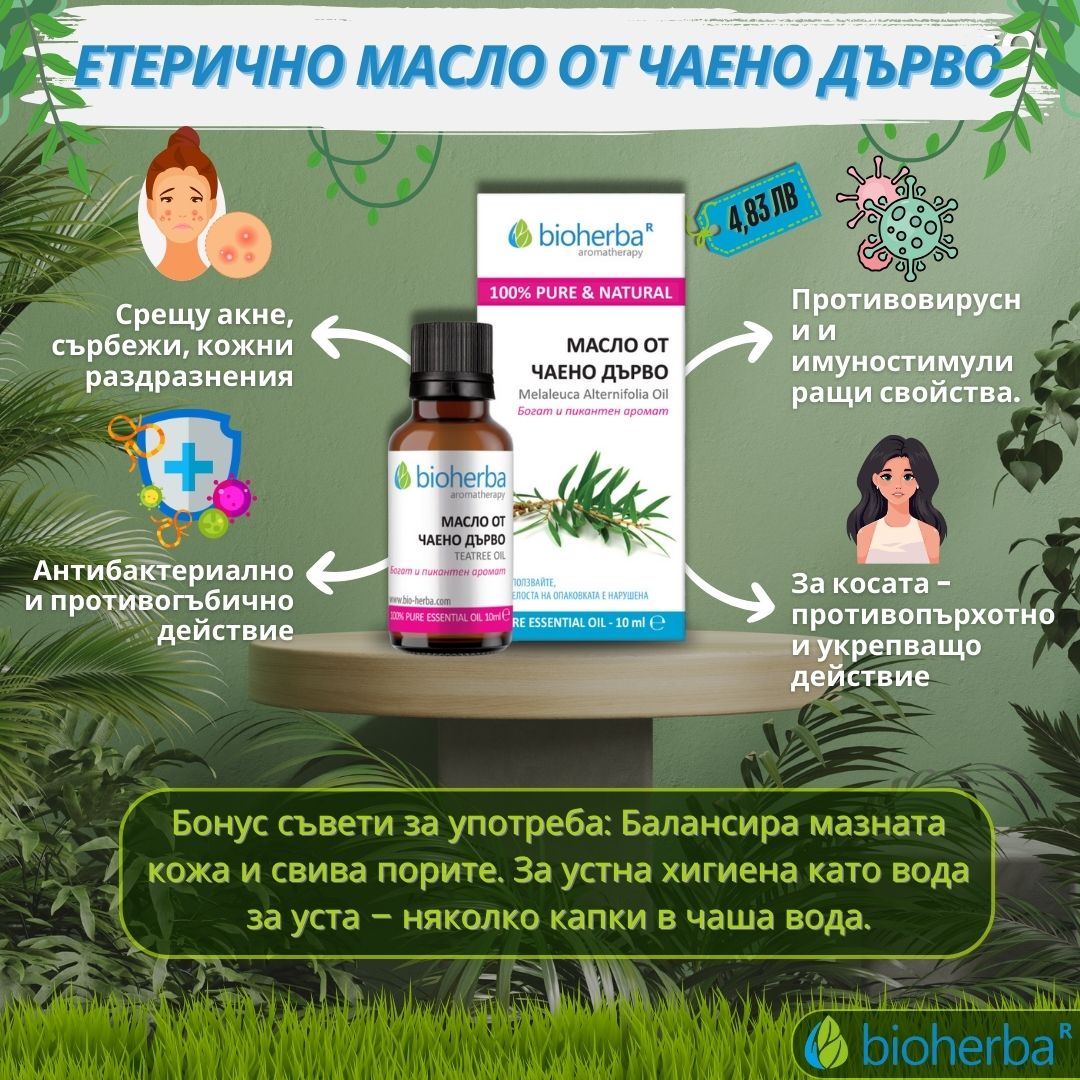 Състав: 100% етерично масло от чаено дърво, получено чрез парна дестилация.