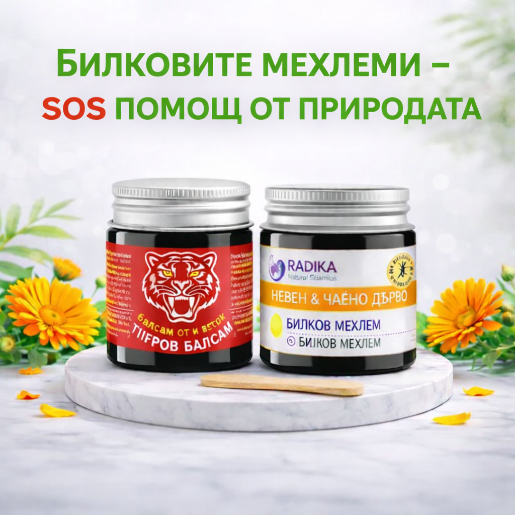 ♥ И нови sos билкови МЕХЛЕМИ - ТИГРОВ БАЛСАМ/ БАЛСАМ ОТ ИЗТОКА, вазелинова основа и богатство от силни съставки. Световноизвестен продукт по традиционна китайска рецепта. Традиционно се използва за облекчаване на: ставни и мускулни болки, хрема, синузит, главоболие, др. И произведения по ваше желание - БИЛКОВ МЕХЛЕМ С НЕВЕН & ЧАЕНО ДЪРВО, Натурален, с восък, екстракти, масла и прополис. С ценни съставки за подкрепа при различни кожни състояния.