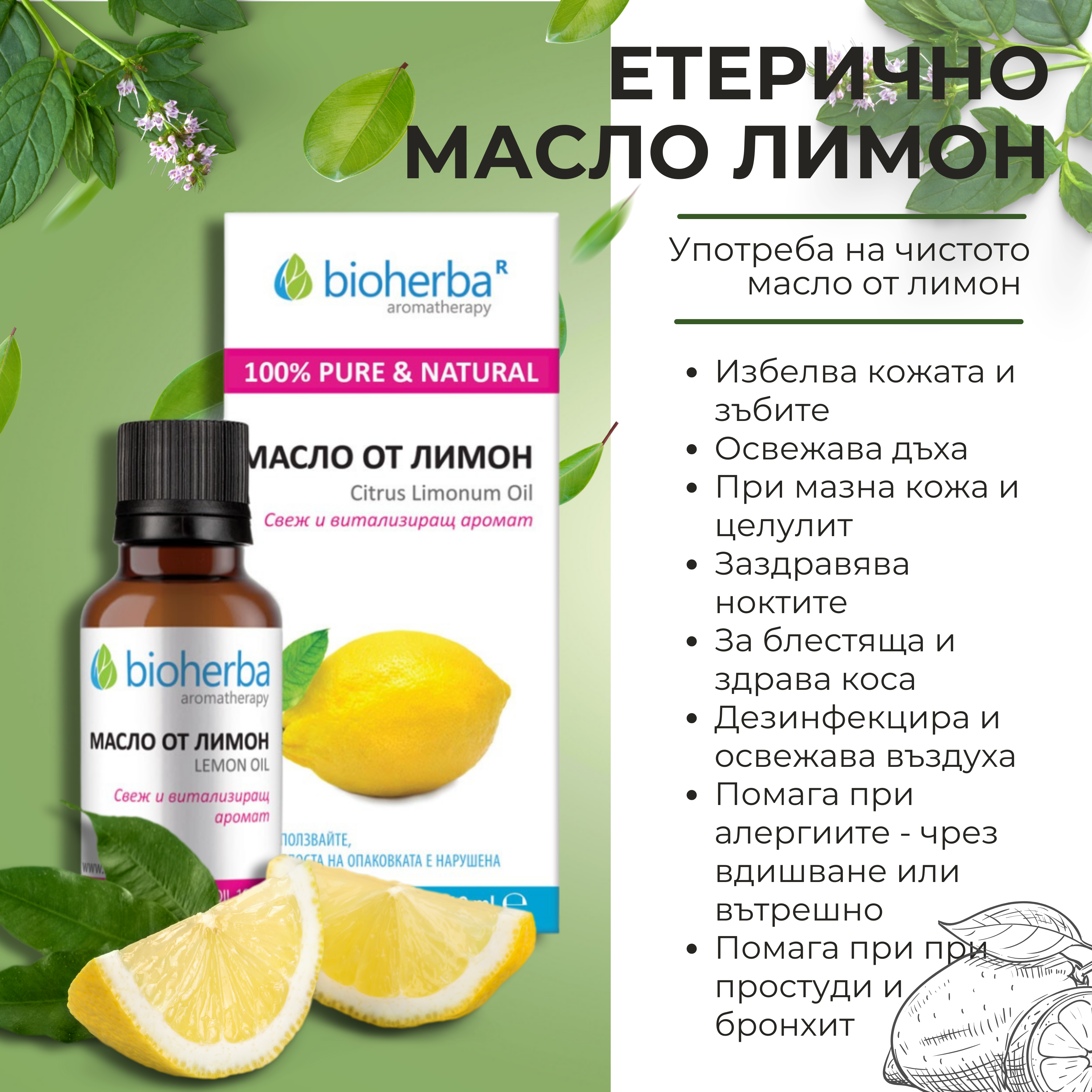 Състав: 100% етерично масло от лимон, получено чрез студено пресоване на корите на лимона.